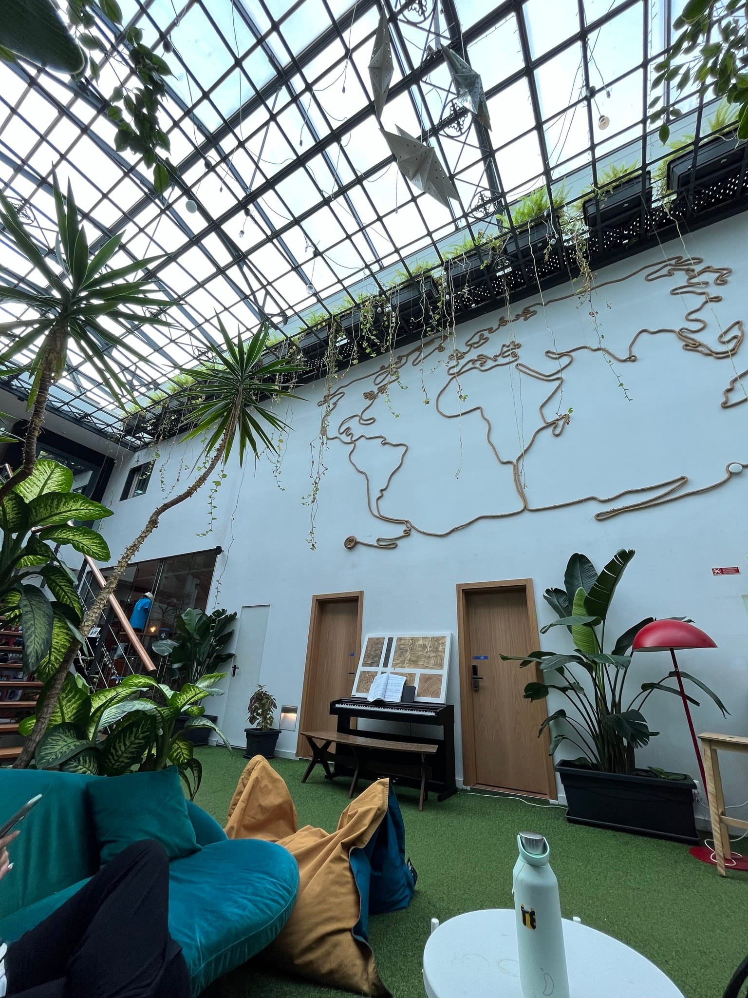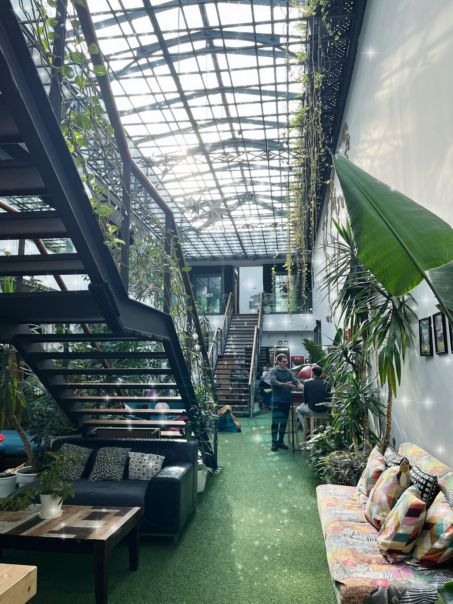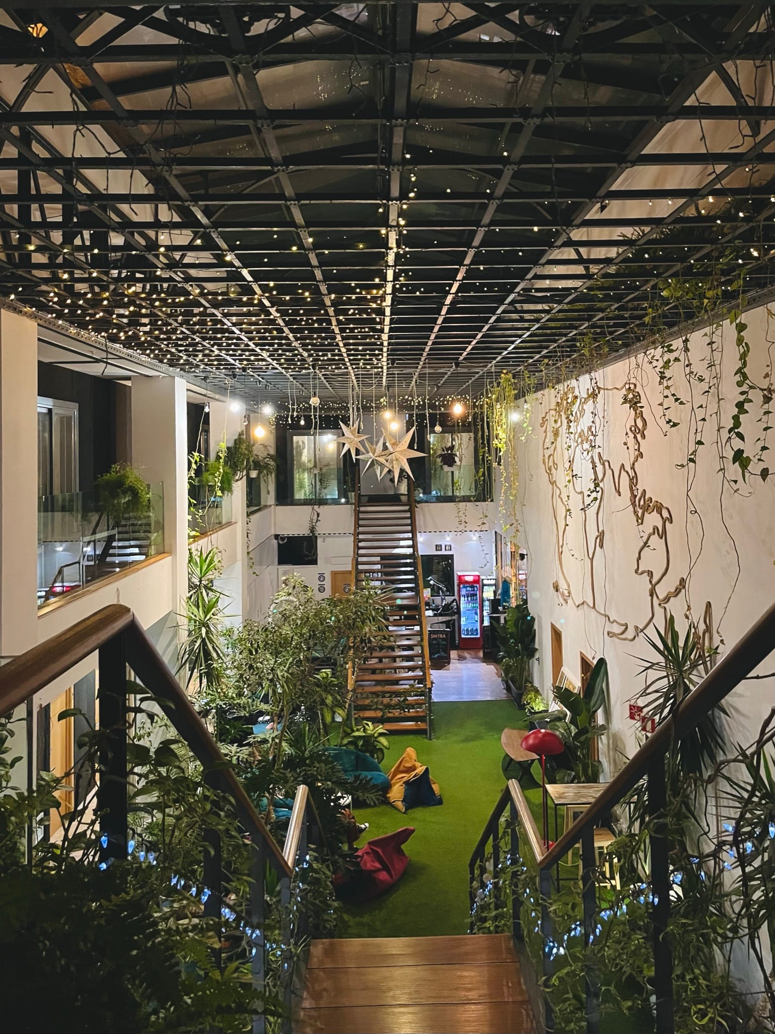 Their main atrium is decorated with greenery, fairy lights, wall art, and an abundance of sofas and couches. The rooms are spread along the perimeter over two floors, similar to China’s si’he’yuan (open-air courtyard residences). The sky-high ceiling offers a flooding of natural light in the daytime.