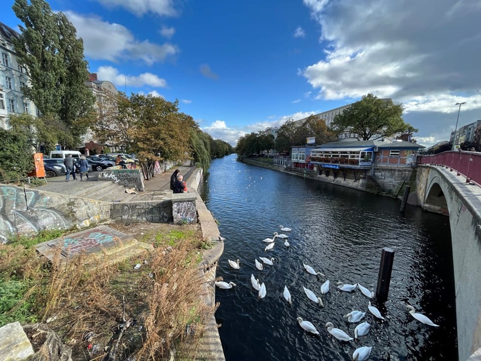 It was a breezy, lighthearted day, the sun shining peacefully on the Spree River. Swans treaded water on its surface. A man threw crumbs for them.