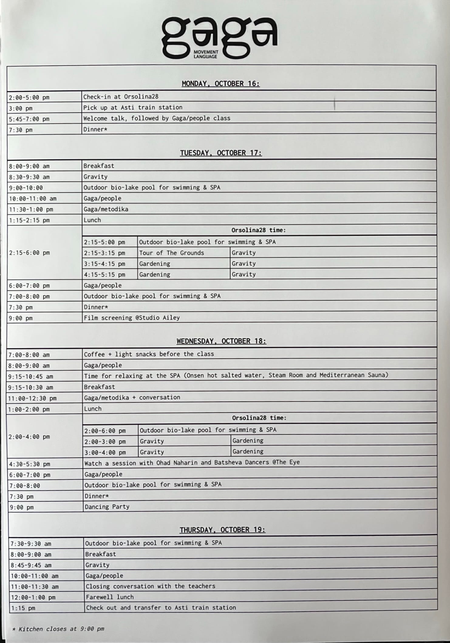 Orsolina28 is primarily a dance school, and our daily schedules reflected that. Of course, we weren’t ten-year-old children, and GagaEden is organized as a retreat, so really it was up to us what we did with our time. (However, since you’re there anyway, you might as well take as many Gaga classes as you can).