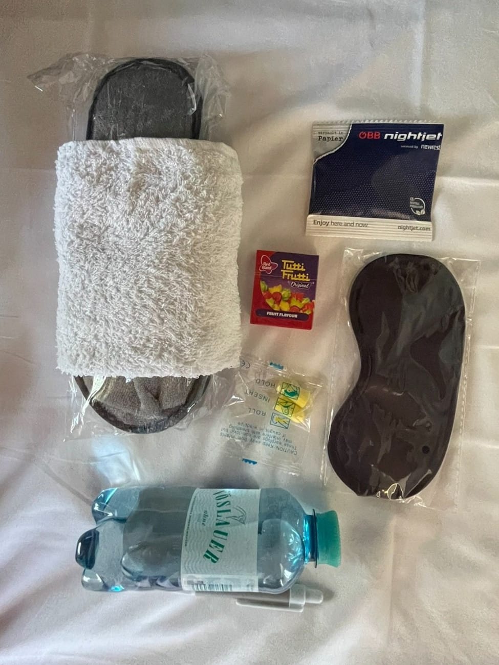 Sleeper cabins also get goodie bags, which include earplugs, a sleep mask, a pen, slippers, a bottle of water, and some Tutti Frutti. I used the slippers immediately, but I didn’t take anything else.