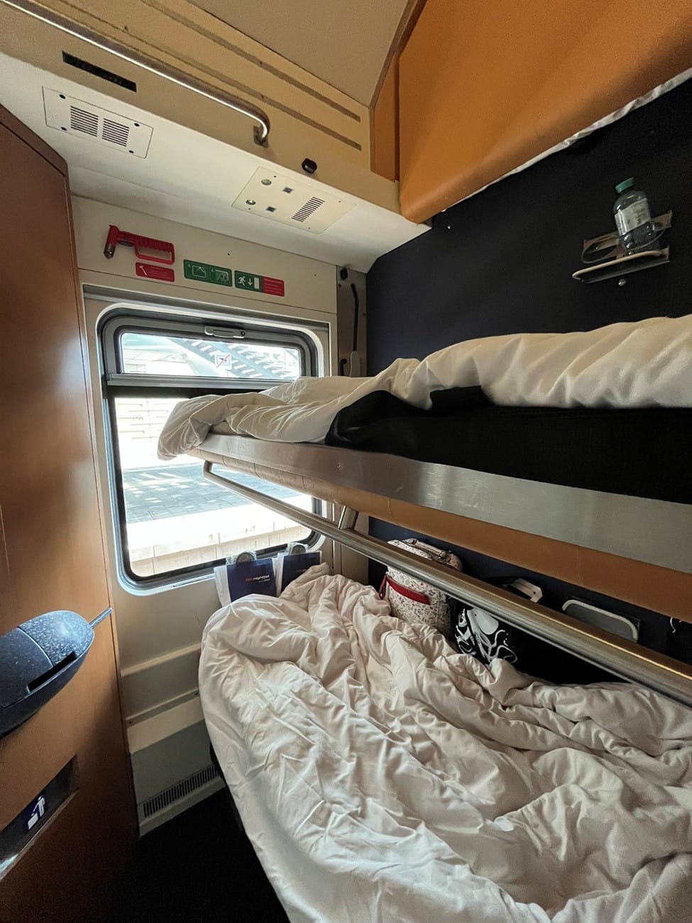 In fact, unless you’re in a luxury sleeper room, the shared ones are extremely tiny. There’s space underneath the bottom bunk for luggage and an alcove higher up for the middle and top bunks, I assume, but everything felt like playing Tetris.