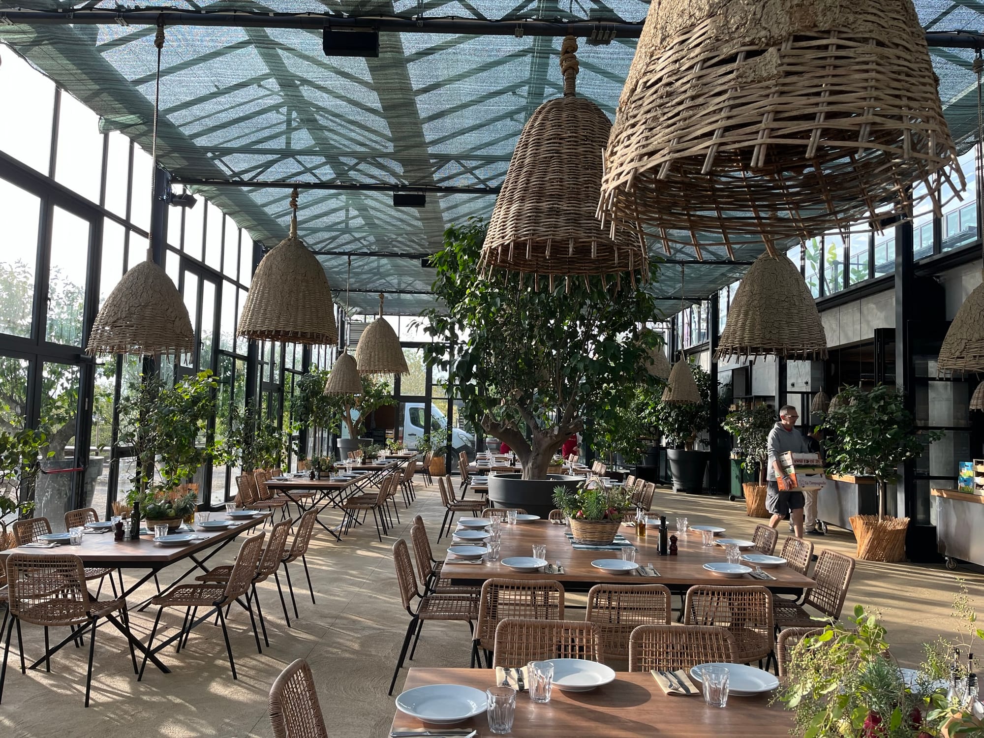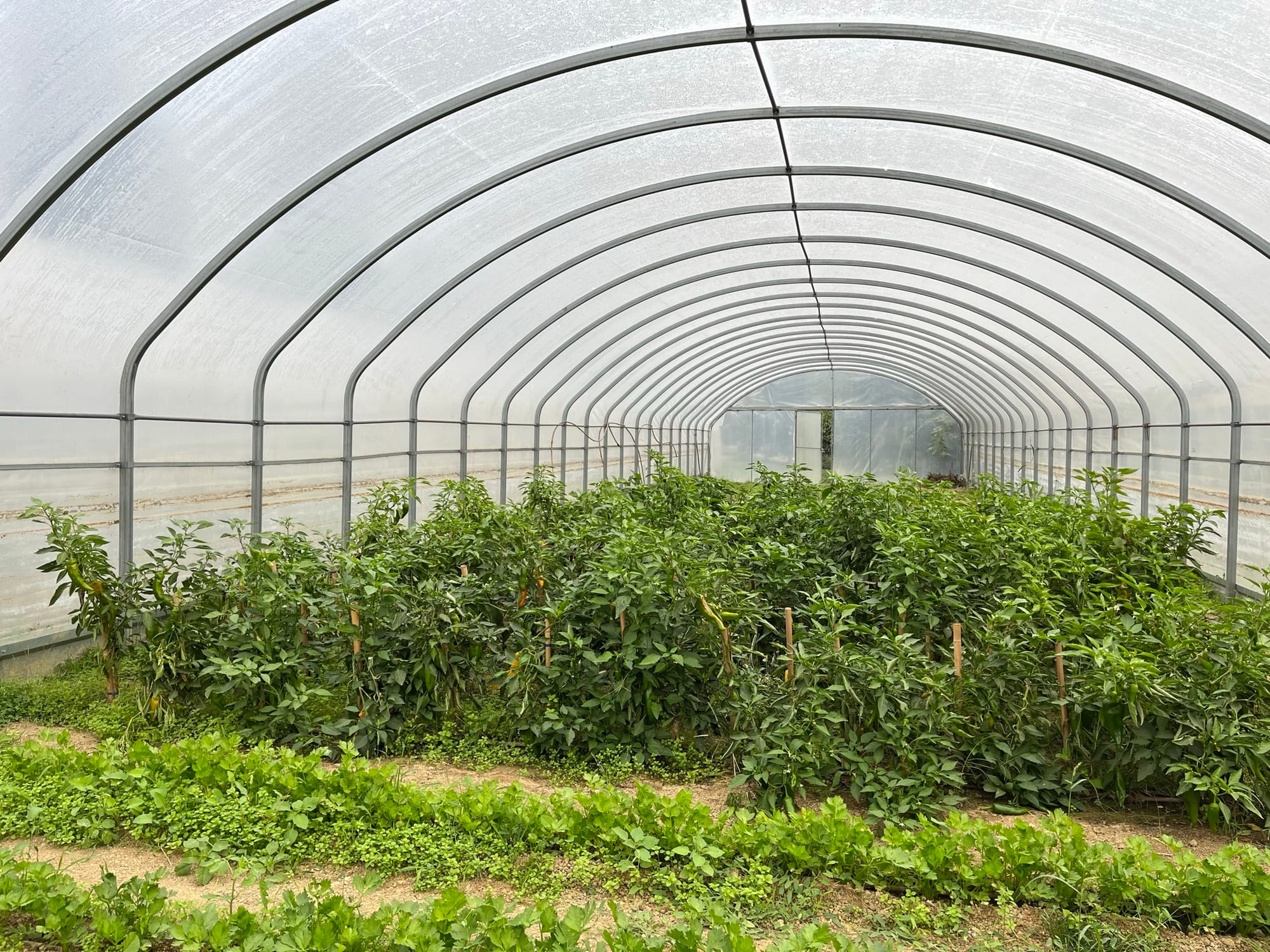 The main gardens are terraced outside the restaurant, open to the elements. There’s a covered greenhouse on the edge of campus growing more varieties.