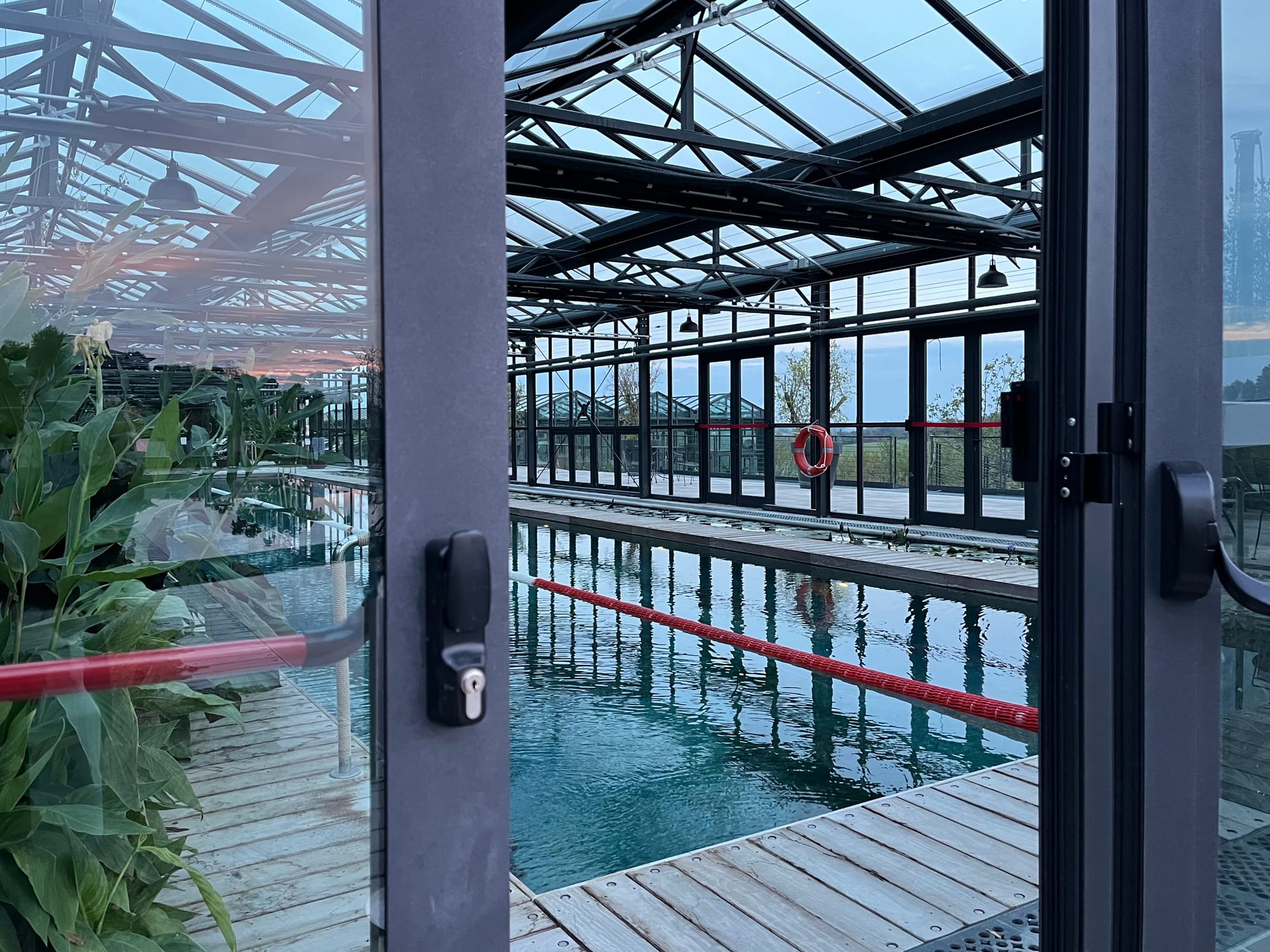 The onsen is located in a large glass building atop the restaurant, next to the indoor swimming pool. Outside on the sunbathing deck is another outdoor pool.