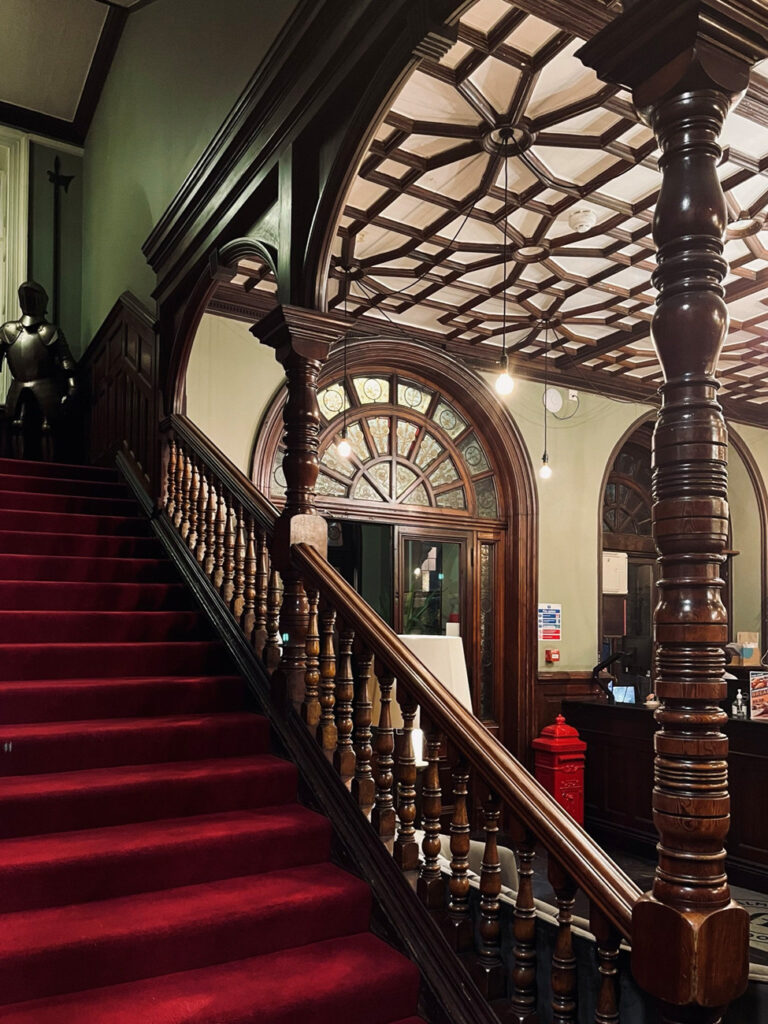 The Lounge — Upon entering the main doors, you’ll see the common lounge straight ahead. It gives the feel of a traditional gentlemen’s club — though much more sparse — no doubt where Lord Palmer entertained his guests back in the day. The room is filled with velveteen armchairs and couches, with a counter table on the side for guests using the outlets. It’s totally ok to eat here. This lounge is more of a reading and study room than a place for loud chatter or noise.