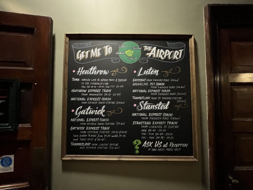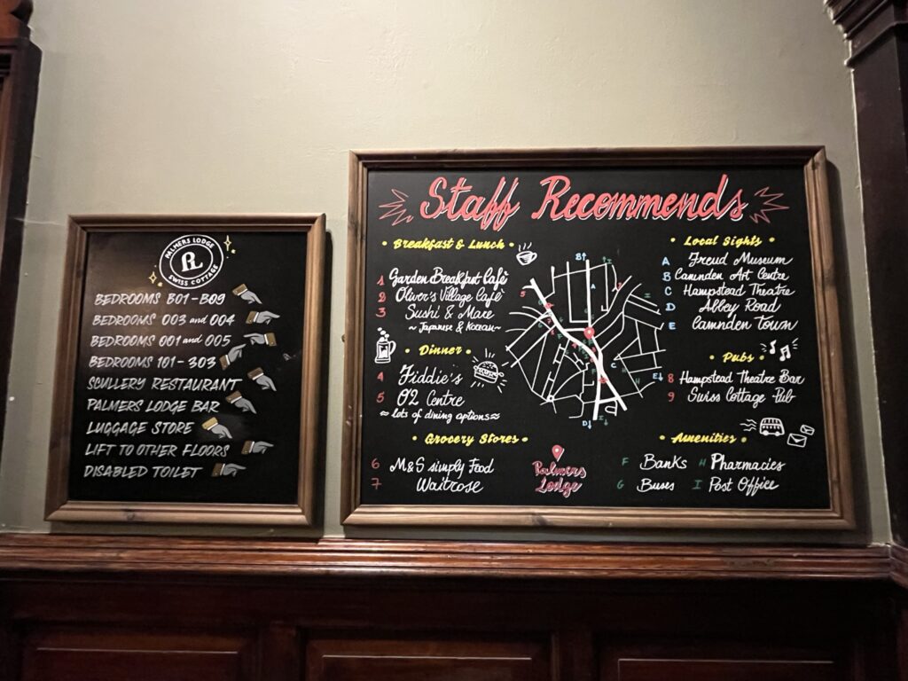 The Chalkboard — Need a recommendation for places to eat? Palmers Lodge features a large chalkboard with their favourite spots to dine out and some other tips and tricks. Or, check out my personal recommendations here for the best places to eat in the Swiss Cottage area (˶˃ ᵕ ˂˶)