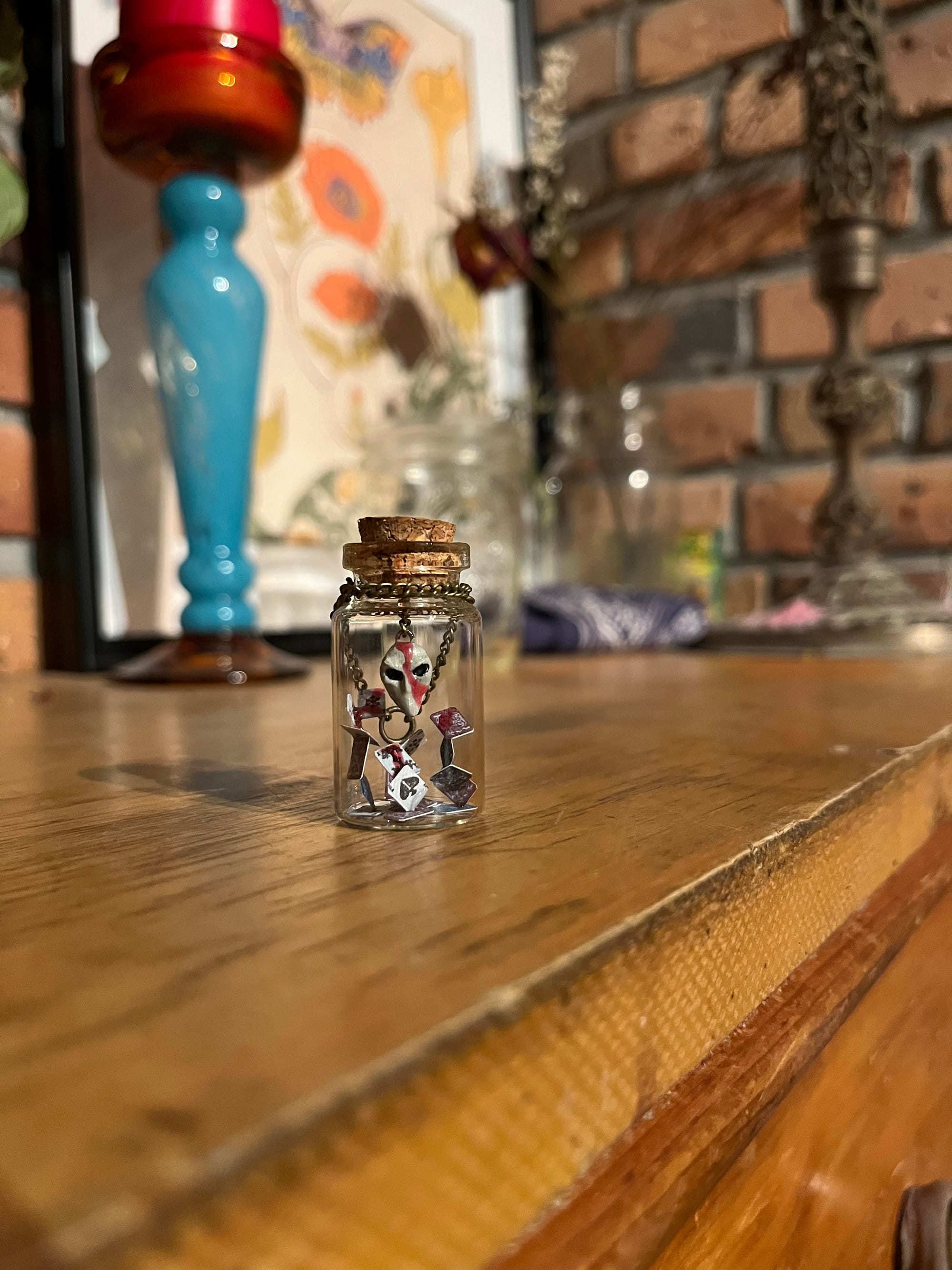 Miraculously, as I was leaving the venue, a girl I had spoken to briefly in the gift shop stopped me. She offered a little trinket she had handmade: a tiny glass jar with the Sleep No More mask and tiny poker cards suspended inside, wrapped thoughtfully in a brown leather pouch. It was beautiful.