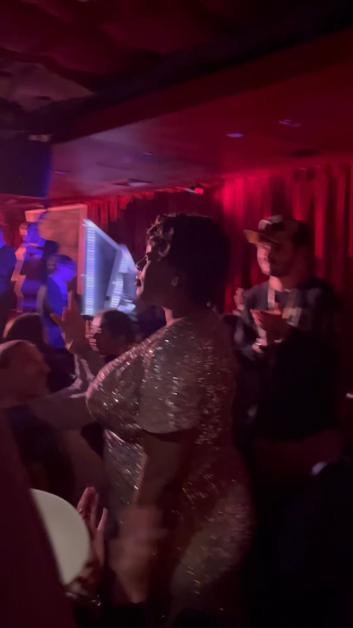 Further downstairs, they unlocked our pouches. From here, we could go back upstairs to buy a drink and enjoy the jazz music. The woman who toasted us at the beginning sang a set onstage, ending with Peggy Lee's tune from 1969,