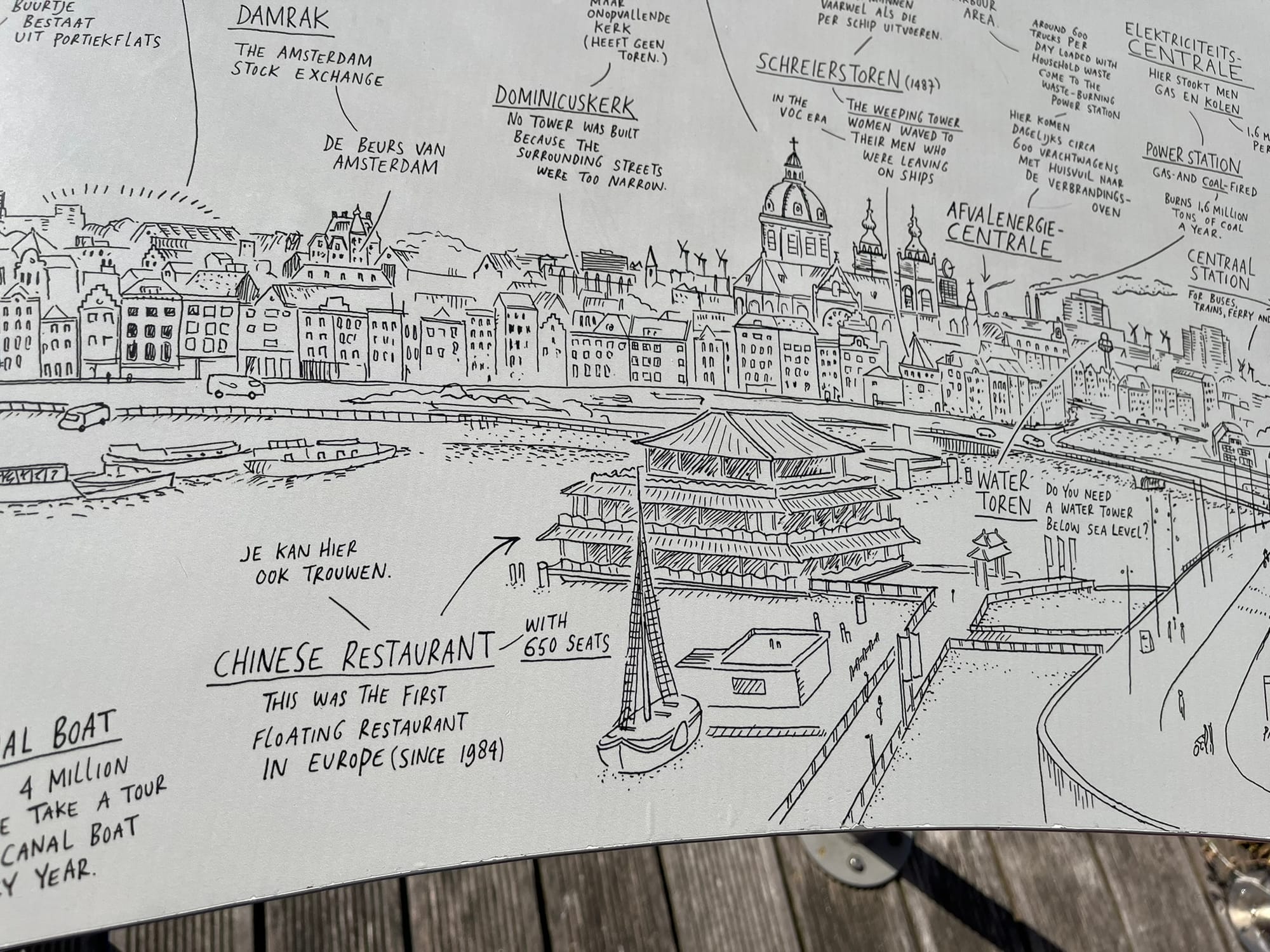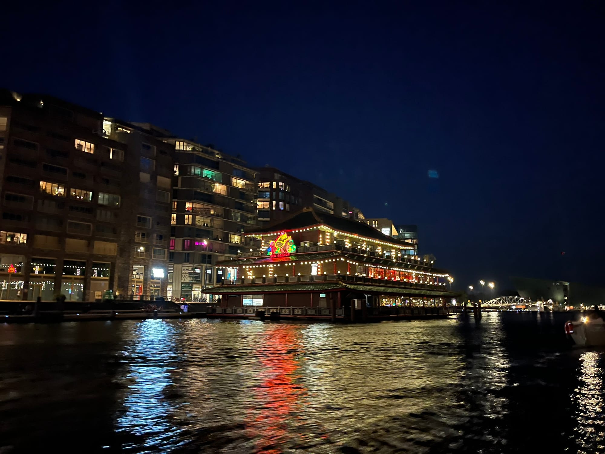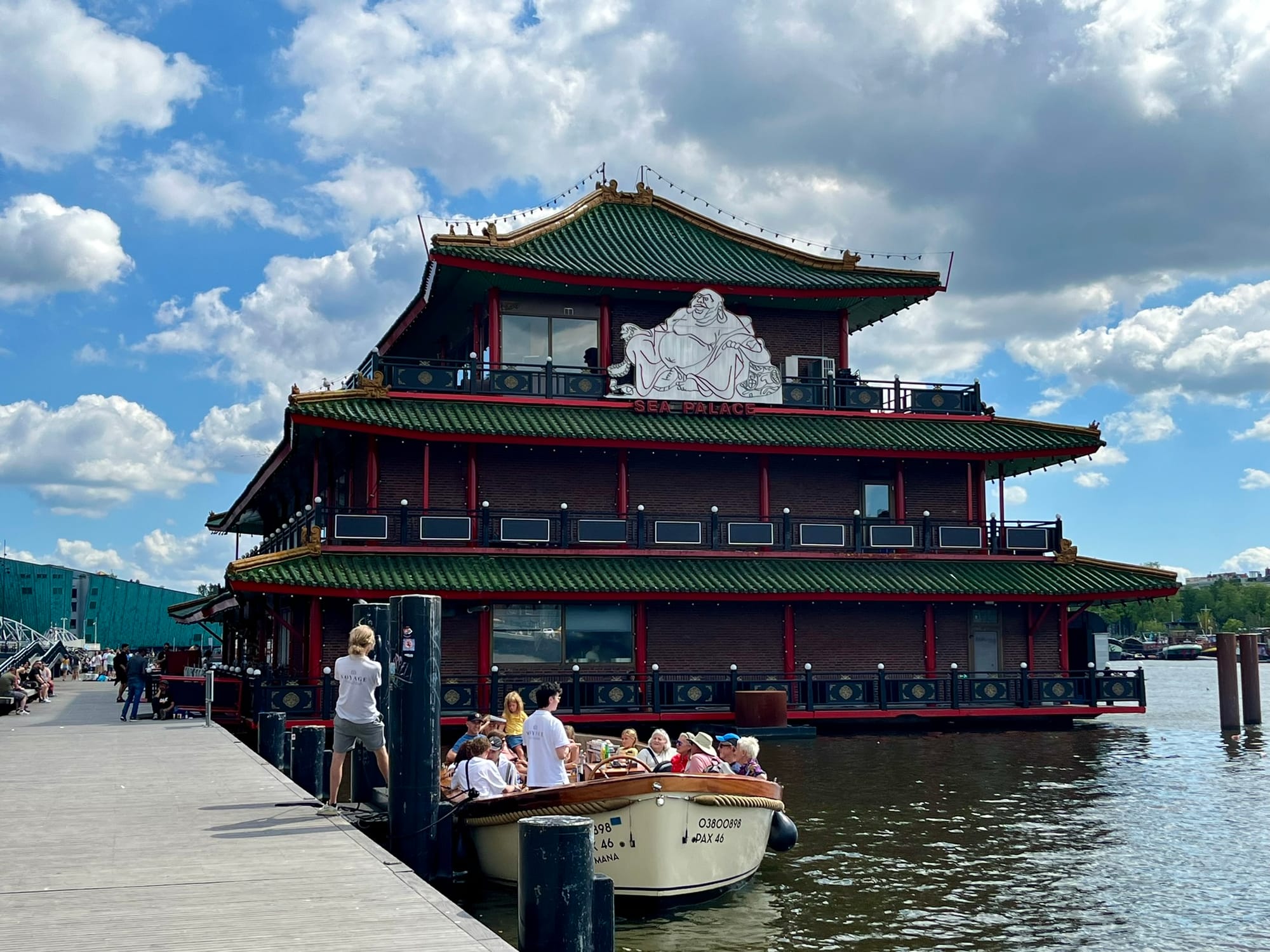 Sea Palace is a floating Chinese restaurant on the River IJ. The story is that this Sea Palace was a copy of the original one in Hong Kong. On its way to maintenance, the Hong Kong one sank, and Sea Palace Amsterdam became the sole bearer of its glory.