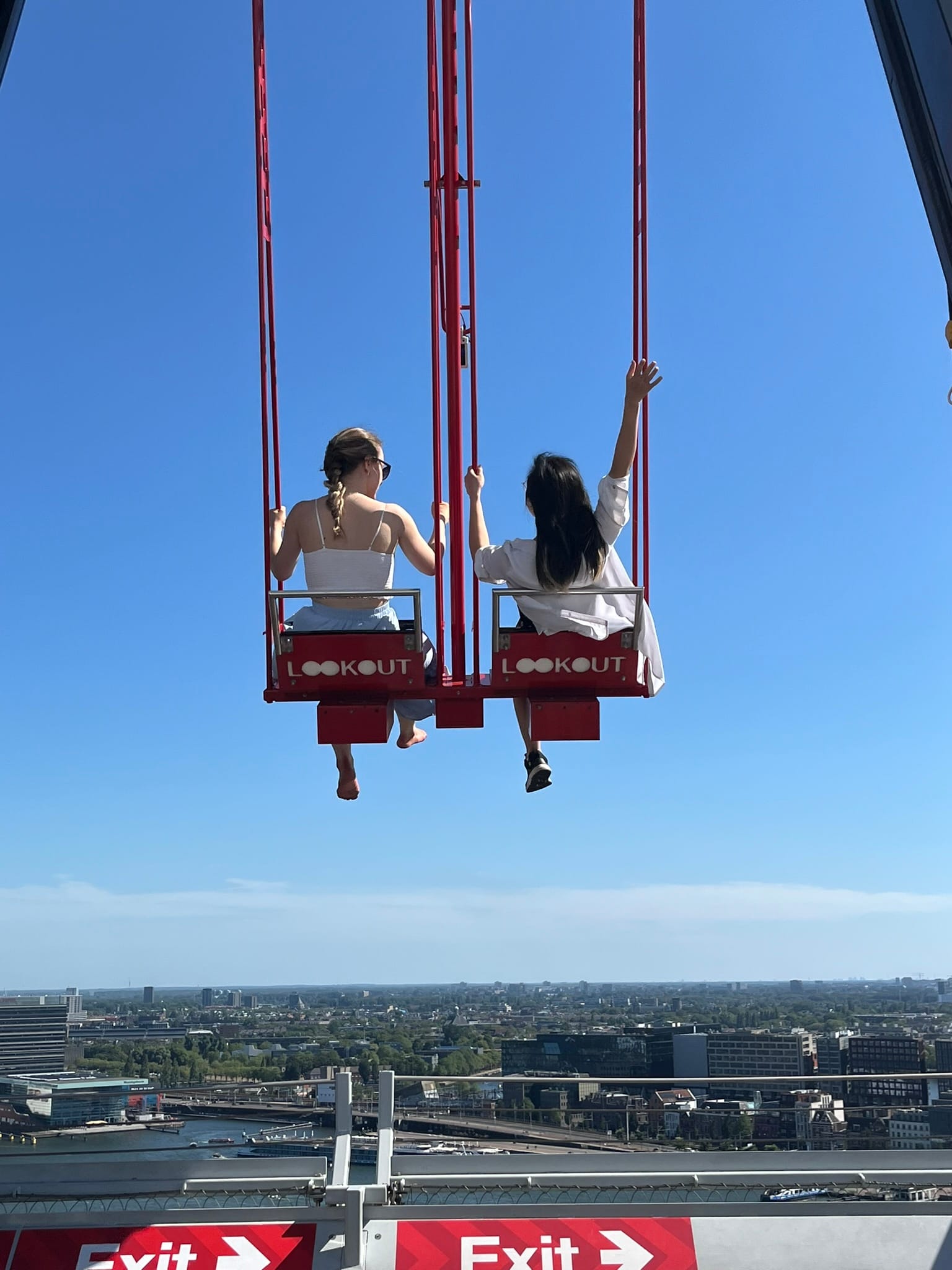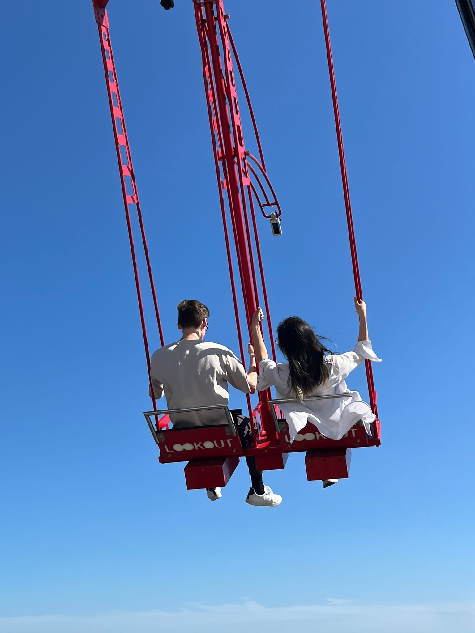 Fear not. It’s actually very tame. The steel-enforced swing has no shaking, no increasing arcs. You swing leisurely with a partner for 1 minute, enjoying the sky-high view, and then they bring you down. If you’re a party of 3, one of you can go again for free.