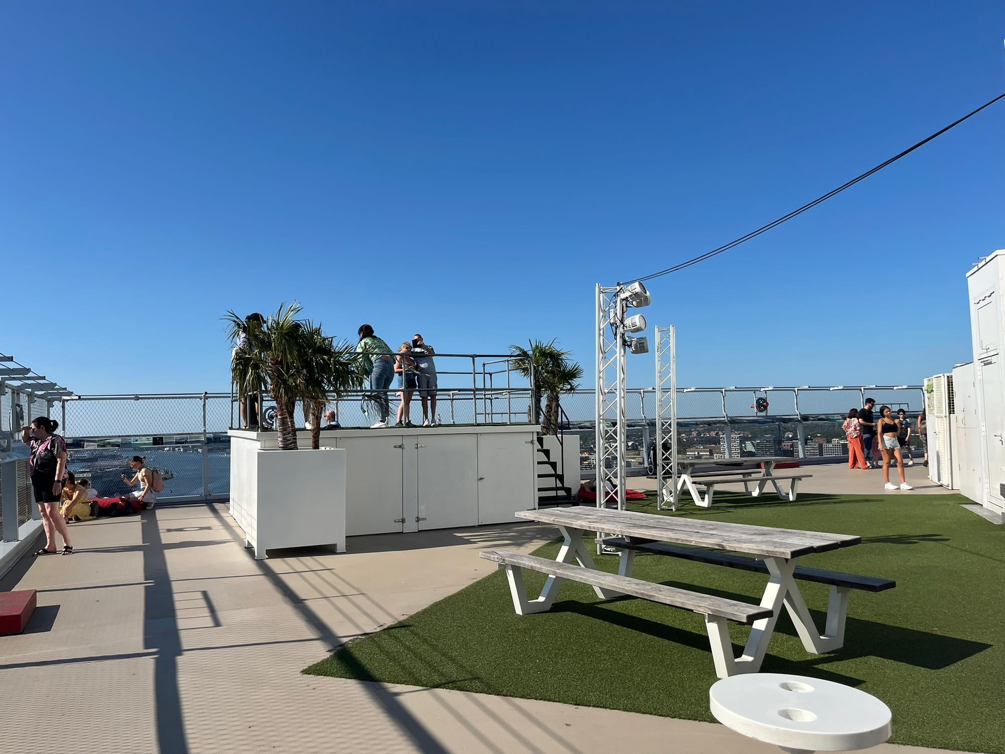 The rooftop is the lookout, and there’s a funky light show in the elevator on the rides up and down. The swing is a separate fee from the lookout itself, but it’s worth the extra 8 EUR.