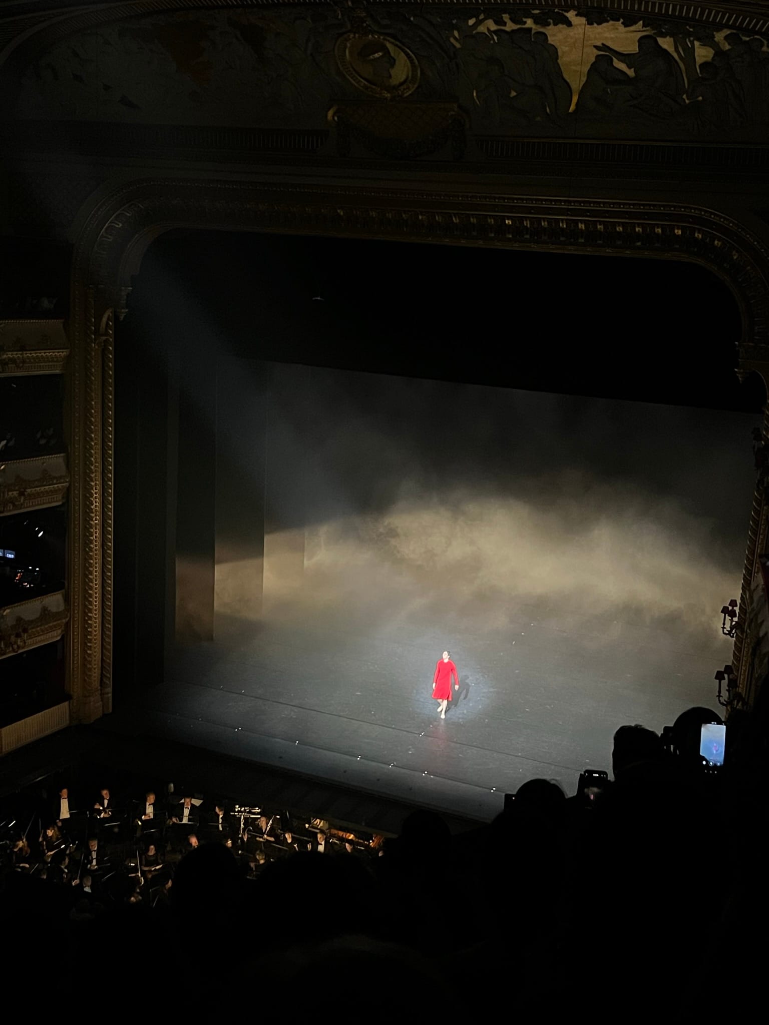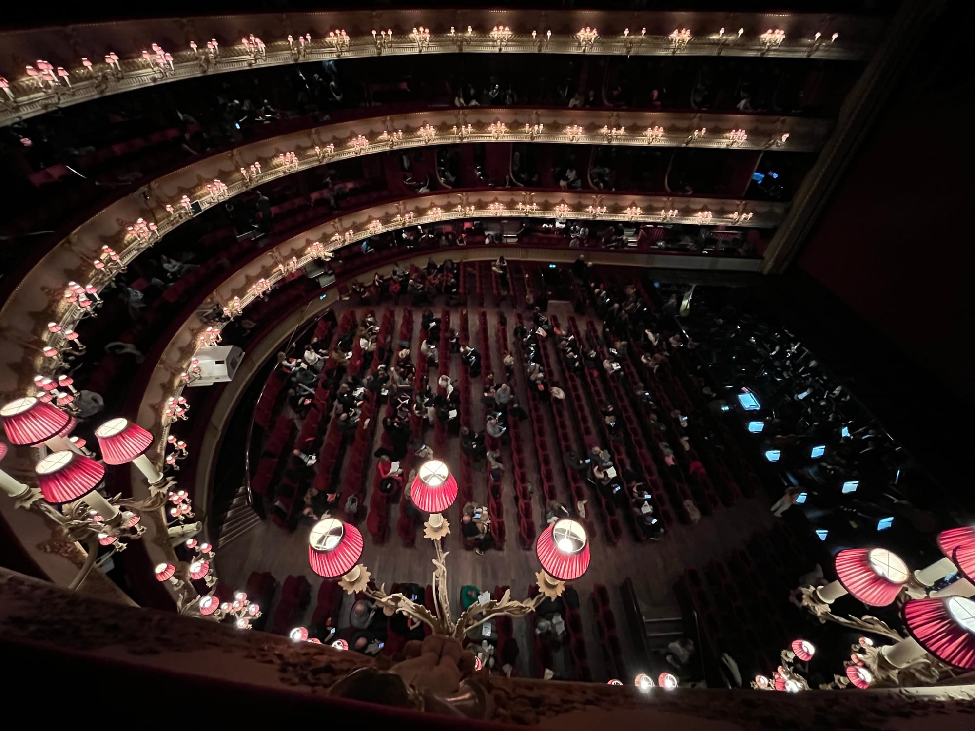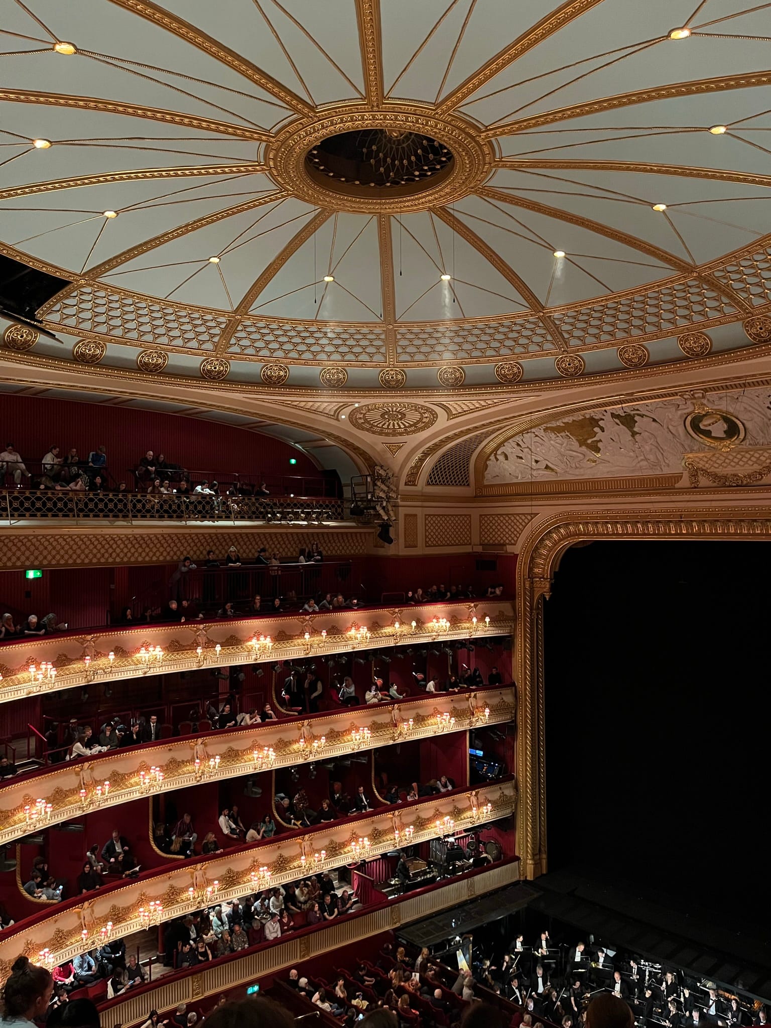 What surprised me about the ROH is how narrow the aisles are. You can tell there’s no space to waste because everything is built upwards — rows upon rows of close-knit seats raked on top of each other. I’m a petite person, and my knees were practically touching the back of the seat in front of me. If a latecomer wanted to slide in there, the whole row had no choice but to stand up and let them pass — no squeezing or contortion possible (unless you want to fall over into the depths of the audience below).
